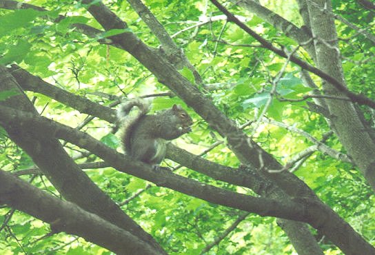 Ever since his release, we've watched for Lucky behind the garage or in the yard near nesting spots. Two months later, March of 2003, we were rewarded with the distinguishable, disabled gait that sets Lucky apart from other backyard squirrels. This past summer we observed Lucky's motor skills and concluded that his head trauma healed extremely well. He still has an uneven stance or tilts to one side when eating nuts. One eye is partially closed, not as open as other squirrels' eyes. Yet he can leap from tree branches and scoot pretty fast when he's chased by other resident squirrels. This past fall * Lucky * was head hauncho - chasing other youngens away from nut and seed dishes. About a 90% recovery rate. And I watched him near a tree collecting or chewing on black walnuts as the weather turned colder.