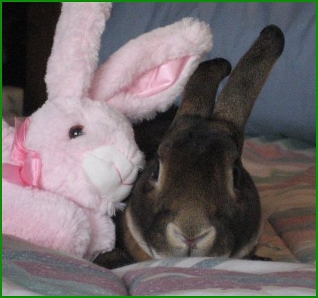 Apr-30-10, from Buddy's caregiver - "Just a little update on the Bud bun. It's been a week and a day since surgery and he's doing great! He had out of crate time yesterday and today and he loves it. He hops around, jumps on and off the bed, snuffs up to my face, burrows under the comforter where it's on the floor. I tried to get pictures of him while he's being so cute but my camera is too slow." A sweet boy. Accepts cuddling. Loving. Litter box trained. Excellent litter box habits.