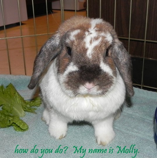Molly is like a big round furry ball with tiny feet. Well, her feet aren't that tiny! She is approximately three years old. She was spayed by a rabbit-savvy vet in Illinois when she became a rescue/foster.