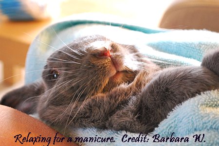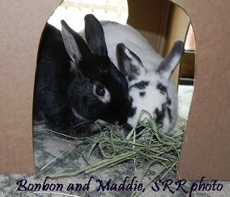 Mary writes, "We decided to rename the buns. Fenton is Bonbon (or, Monsieur Bonbon if you'd like to be proper) and Korri is now Madeleine (Maddie) because she is shaped like one of those French cookies - but, thinning out with all of her binkying.
