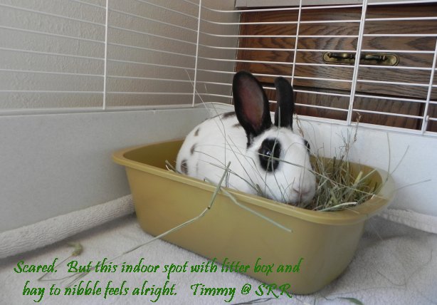 Tim was observed running loose for a few months. He hid under trailers, boats, cars; not a good environment for a domestic rabbit. When good samaritans captured him in a Hav-a-hart trap, his paws were dirty from foraging in the ground.