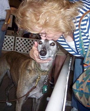 Ken Bloss holds Doppler while rescue greyhound Carley sniff each other's noses.