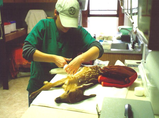 Allie tends to a fawn whose leg was run over and damaged by an ATV.